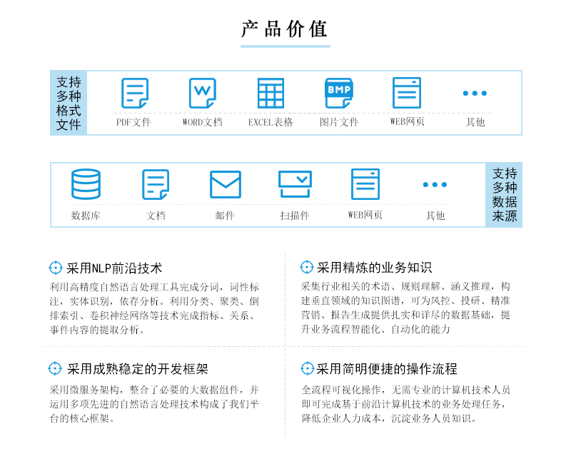 基于垂直領域的行業知識,依托OCR、自然語言處理、知識圖譜等前沿技術,構建從海量非結構化數據中提取關鍵信息的平臺,包括原生關鍵信息精準抽取、派生關鍵數據自動推理等能力。從而提升工作效率,降低人工成本,擴大數據覆蓋度及增強數據時效性。