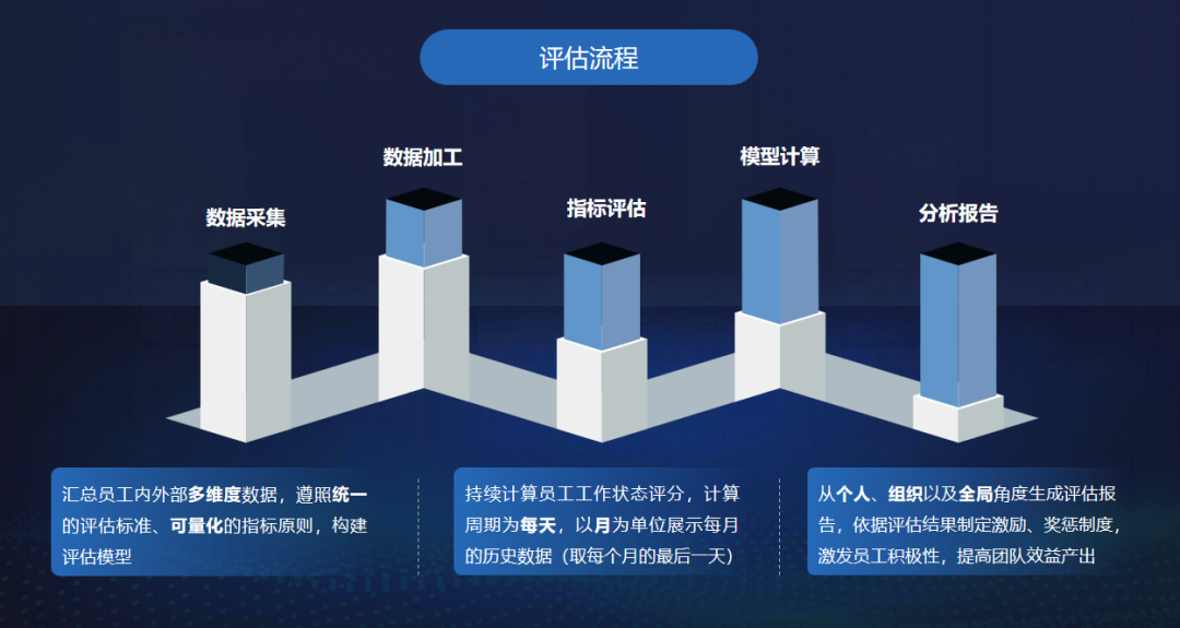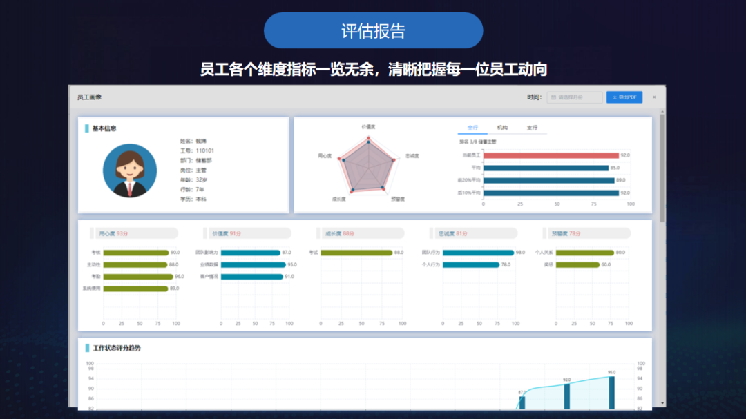 個(gè)人評估報(bào)告:展示個(gè)人工作狀態(tài)評分、趨勢、畫像數(shù)據(jù),幫助管理者了解員工工作狀態(tài)和成長潛力。